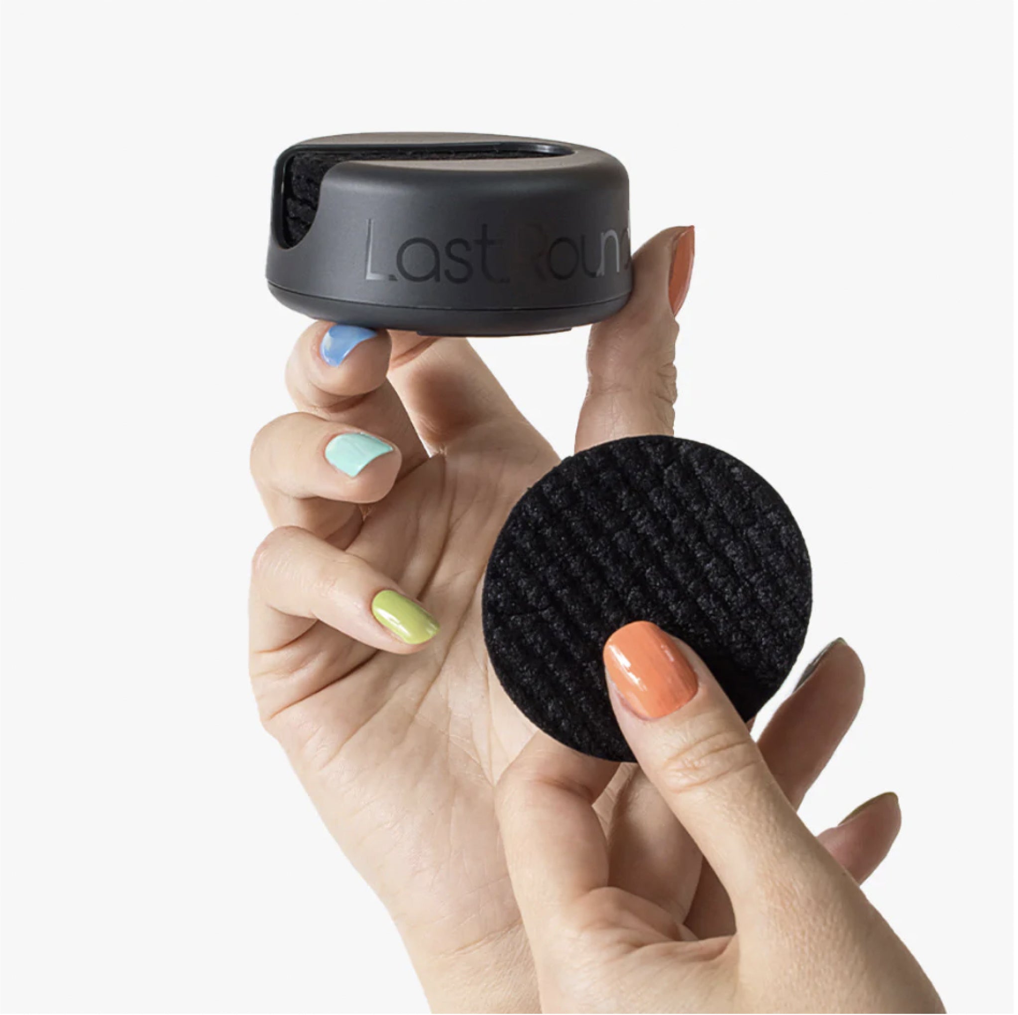 LastRound ist von Natur aus recht fest, aber es wird weich und lässt sich wunderbar verwenden, wenn du etwas Wasser hinzufügst. Drücke das überschüssige Wasser aus, bevor du den Entferner, das Gesichtswasser oder andere Produkte hinzufügst (keine Sorge, sie werden nicht verwässert, und das Pad absorbiert genau die richtige Menge).