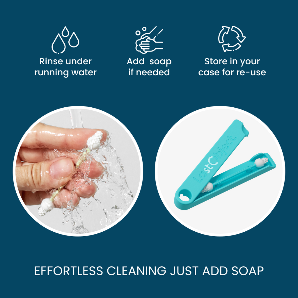 Dein LastSwab ersetzt etwa 1000 Einweg-Stäbchen. Damit es so lange wie möglich hält, solltest du es nach jedem Gebrauch vorsichtig reinigen. Verwende deine Fingerspitzen und reibe die Spitzen mit Wasser und Seife ab, um sie sauber zu bekommen. Bewahre es immer im Etui auf und halte es von Hitze fern. Reinige das Etui mit Desinfektionsmittel und niemals in der Spülmaschine.